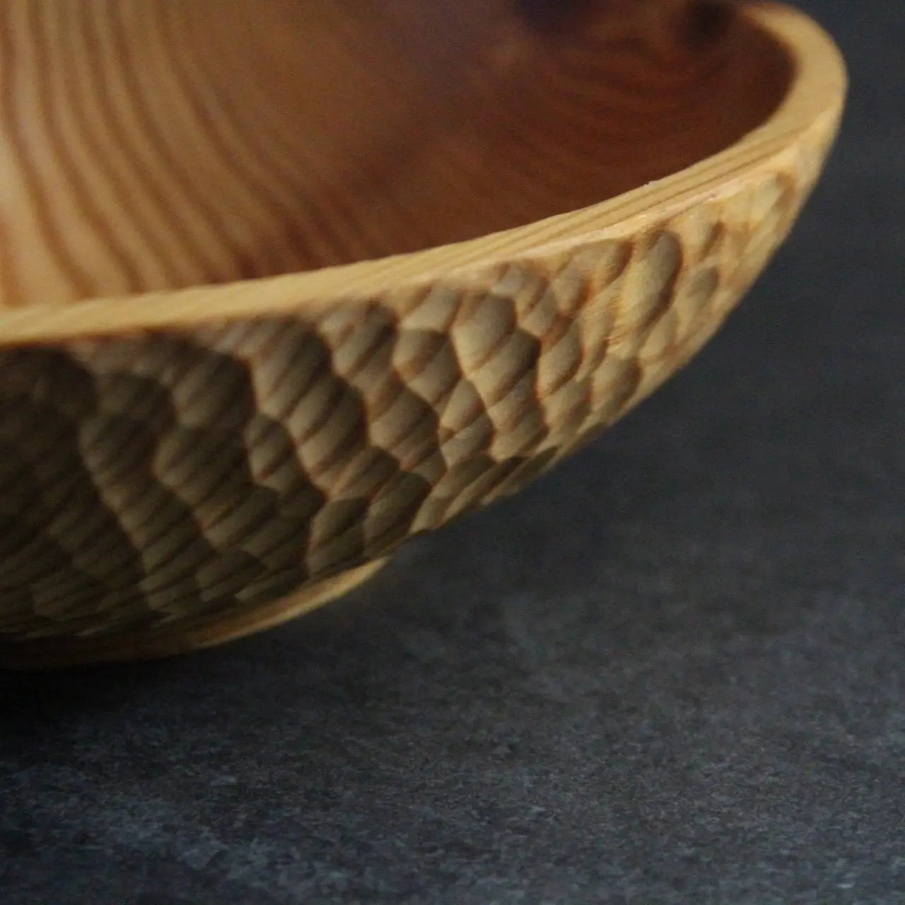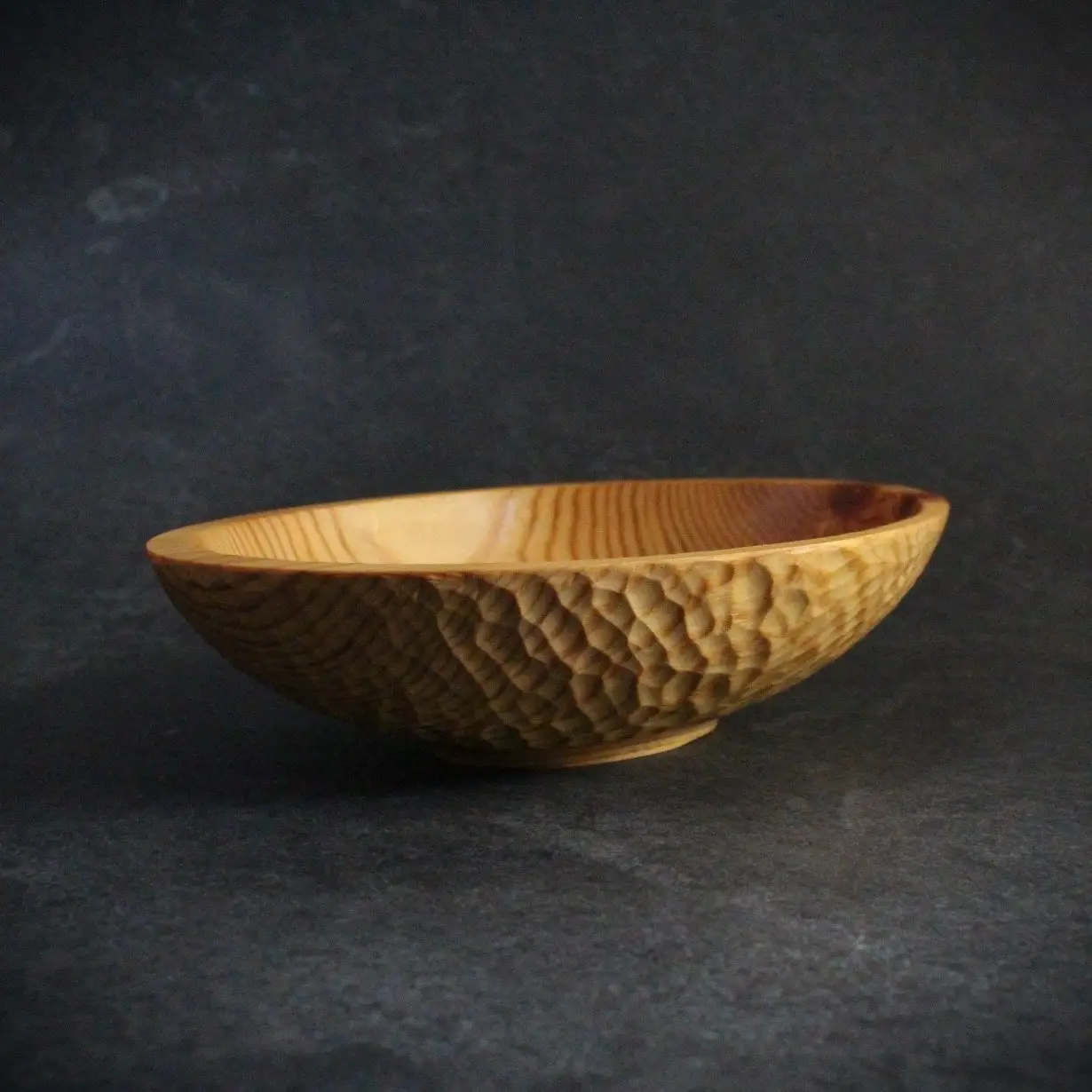 Technique artisanale : Texture gougée sculptée à la main, créant un relief unique qui distingue votre pièce de toute production industrielle. Chaque coup de gouge sublime les veines naturelles du bois.