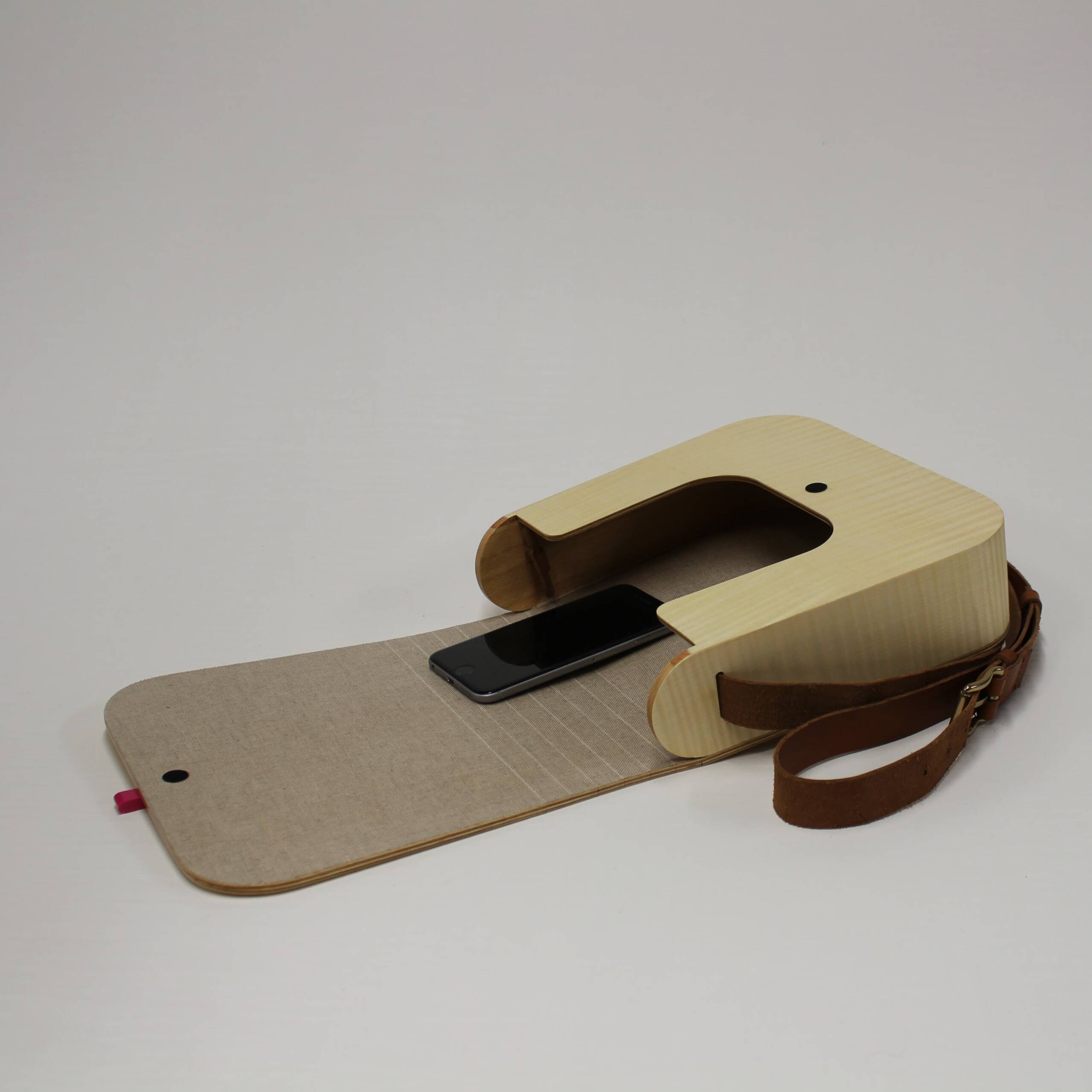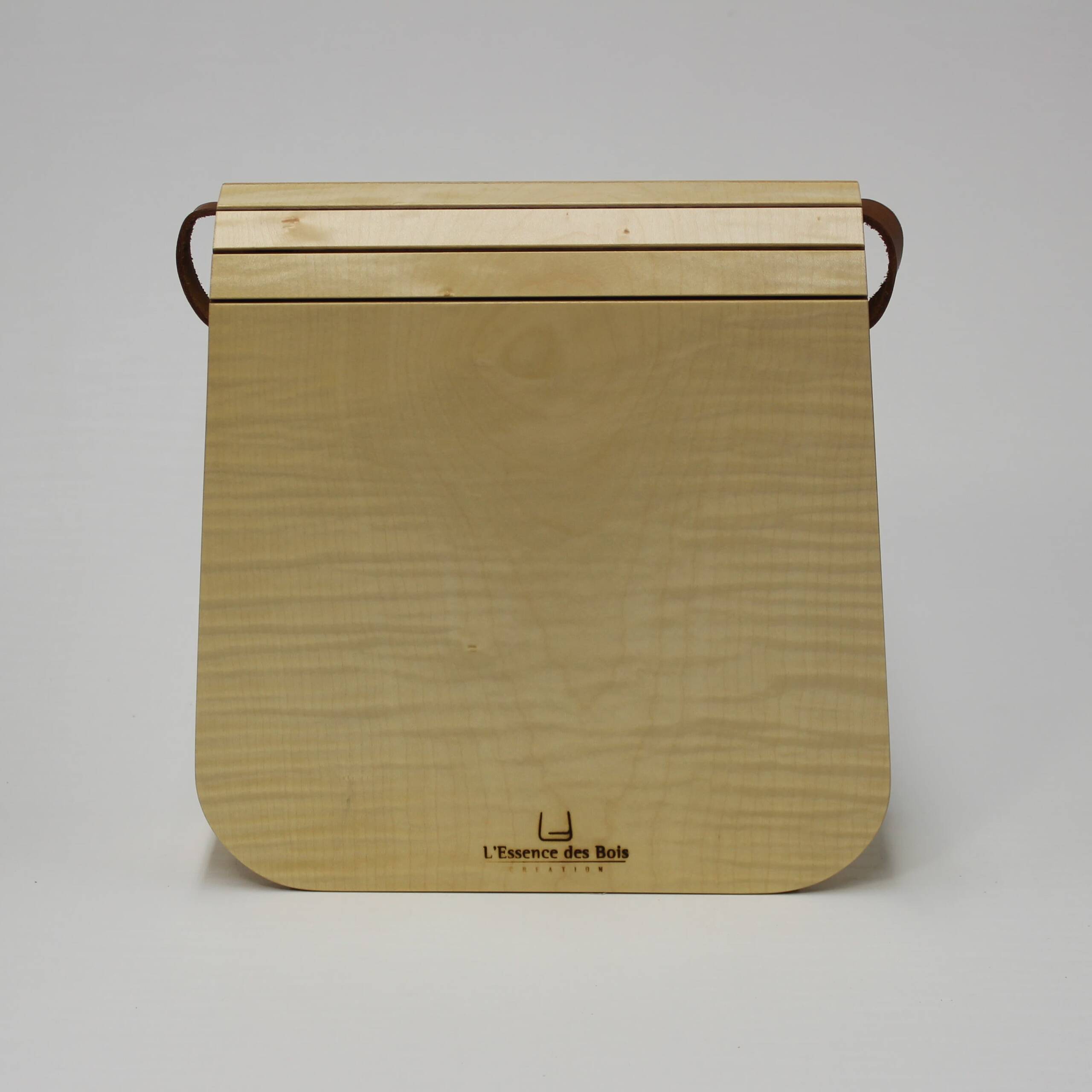 Besace en érable sycomore et bandoulière en cuir véritable fabriquée artisanalement en France par L’Essence des Bois. Un sac en bois haut de gamme, durable, élégant.