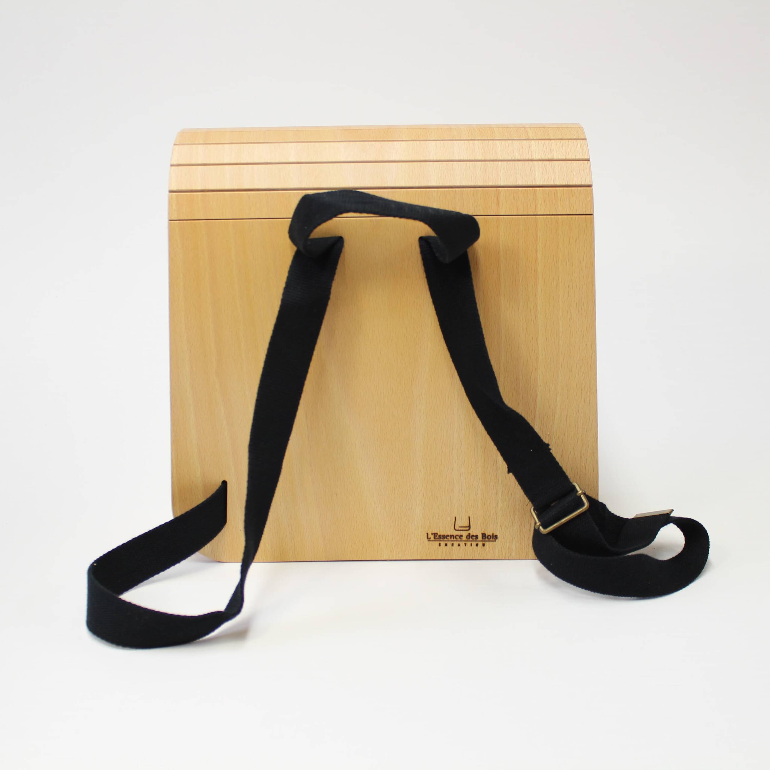 Les deux bretelles en tissus, réglables grâce à des boucles en laiton, ajoutent une touche de sobriété élégante. Elles assurent un ajustement parfait, tout en renforçant le contraste noble entre le tissu, le métal et le bois.